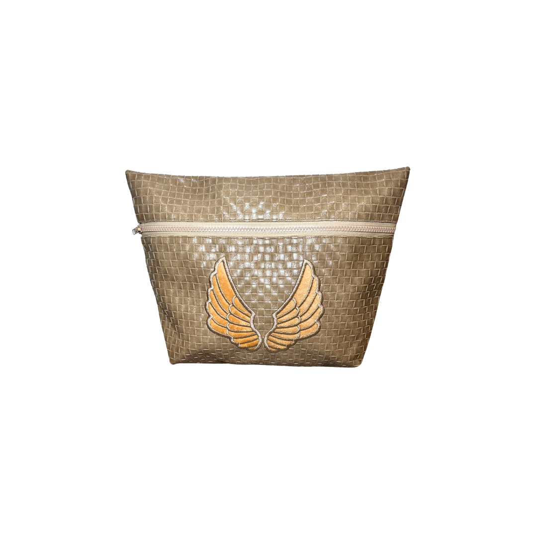 100% Handmade multipurpose bag in durable materials vinyl, leather, and recycled nylon. Features a large zipper pocket and a colorful embroidered design on the front.
