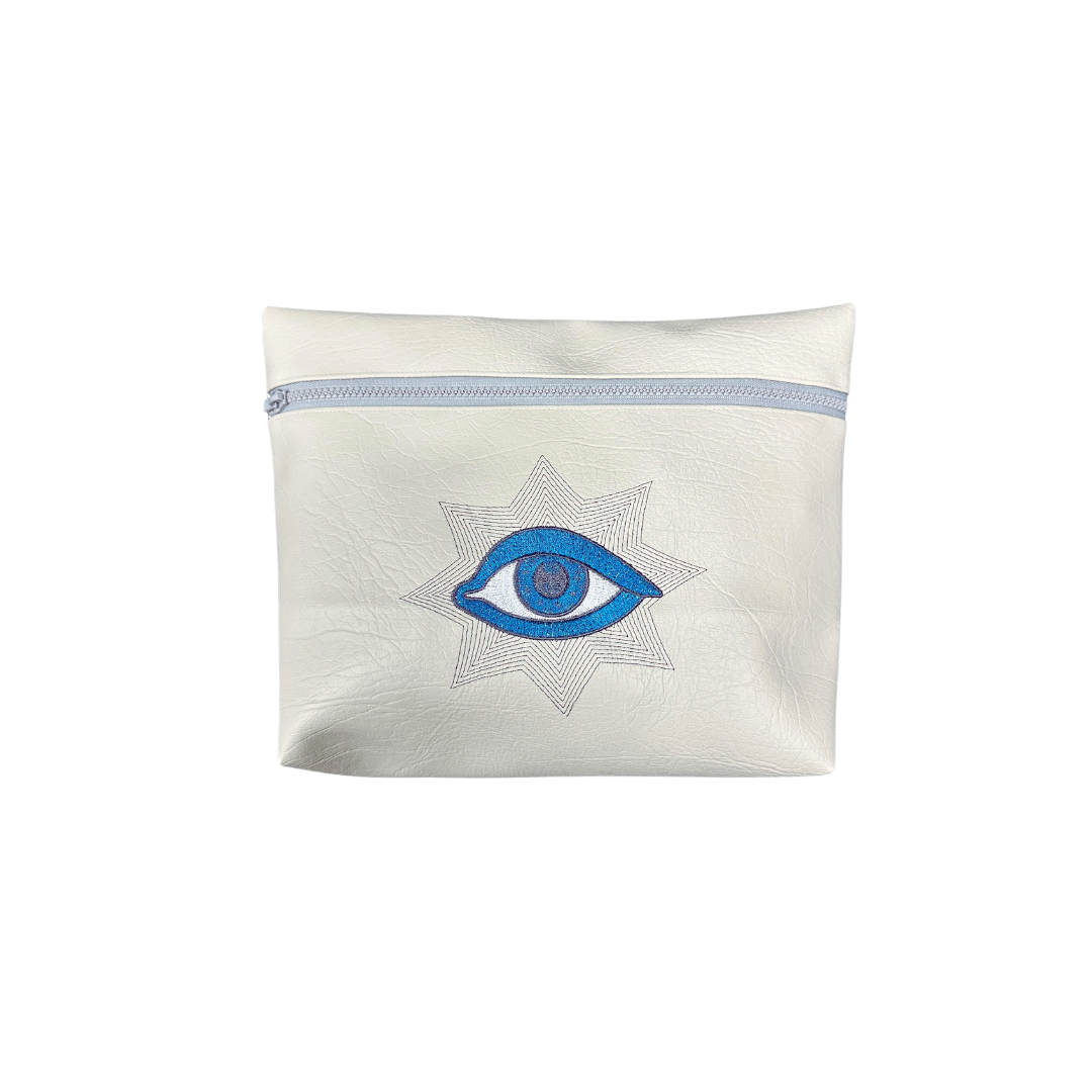 100% Handmade multipurpose bag in durable materials vinyl, leather, and recycled nylon. Features a large zipper pocket and a colorful embroidered design on the front.