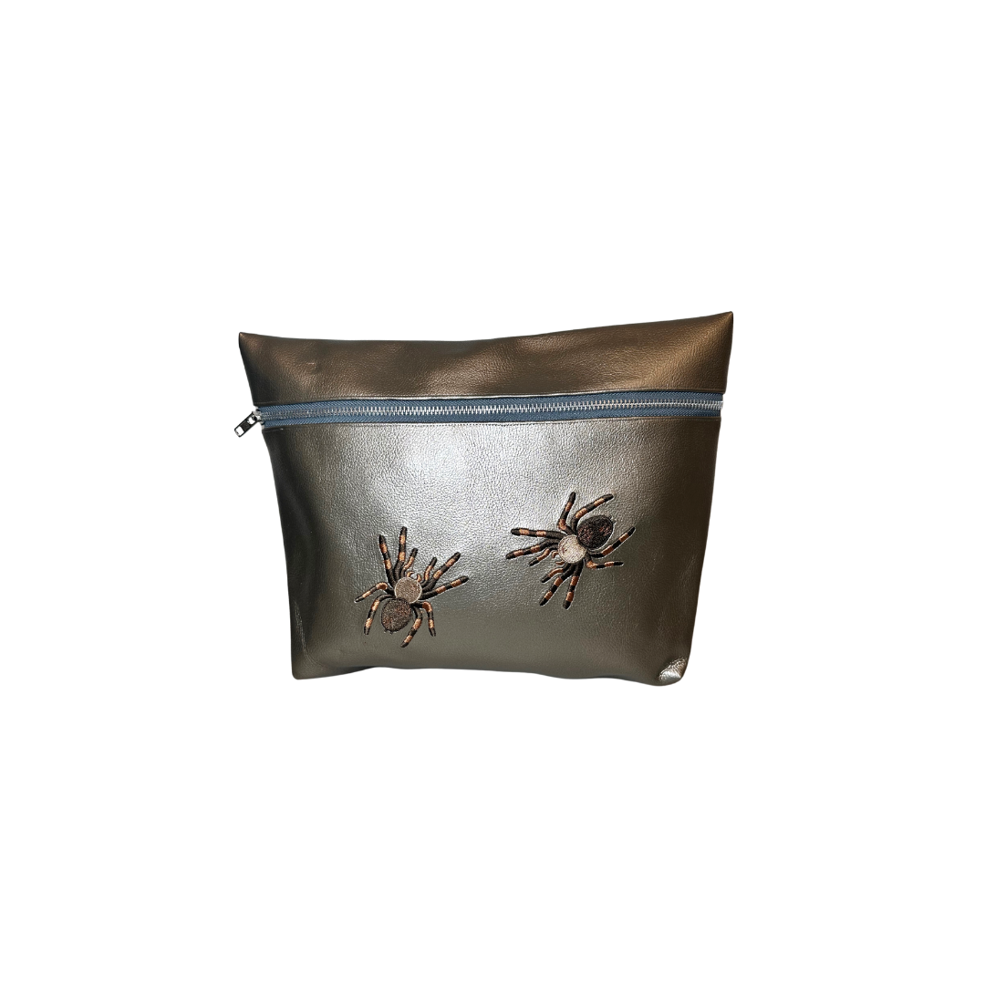 100% Handmade multipurpose bag in durable materials vinyl, leather, and recycled nylon. Features a large zipper pocket and a colorful embroidered design on the front.