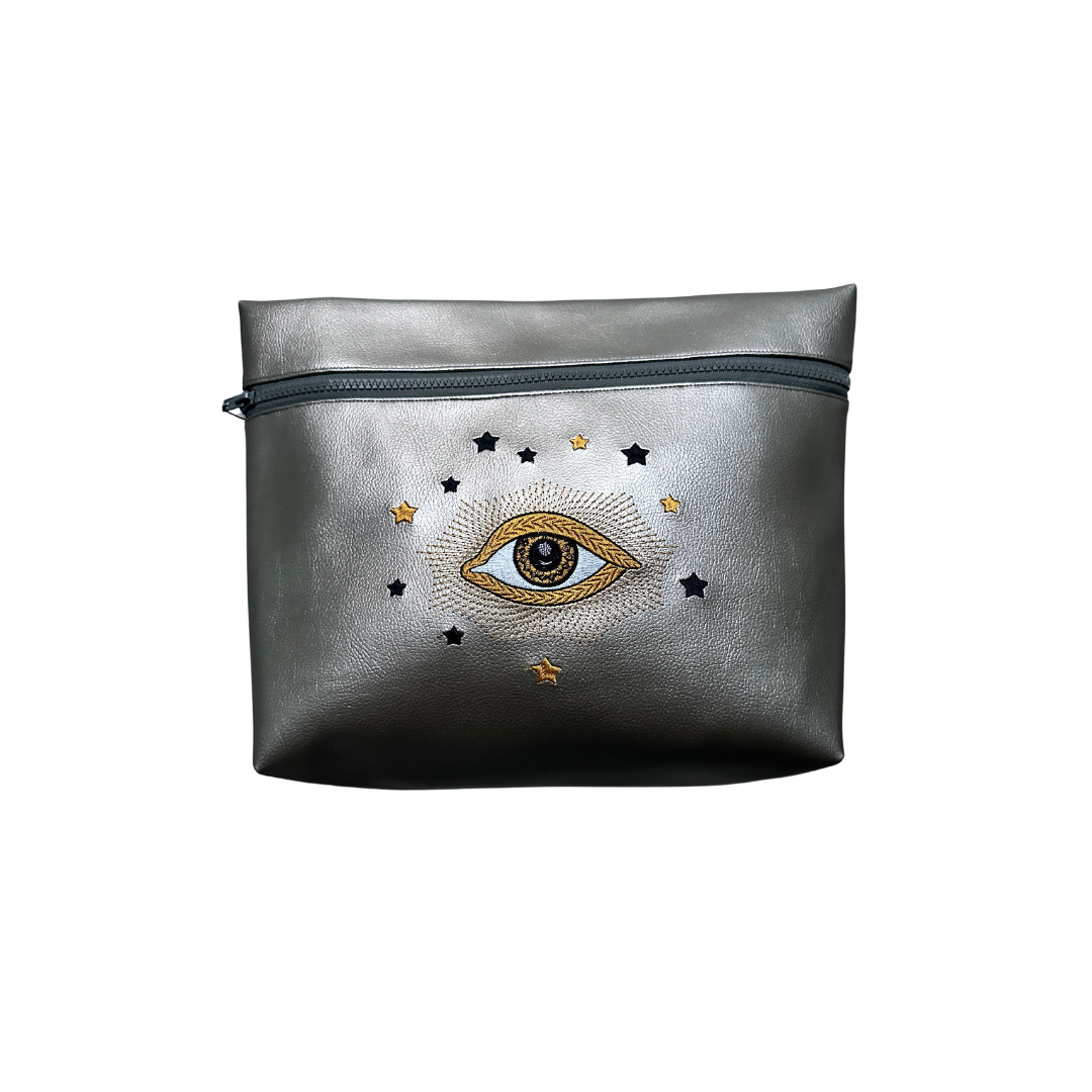 100% Handmade multipurpose bag in durable materials vinyl, leather, and recycled nylon. Features a large zipper pocket and a colorful embroidered design on the front.