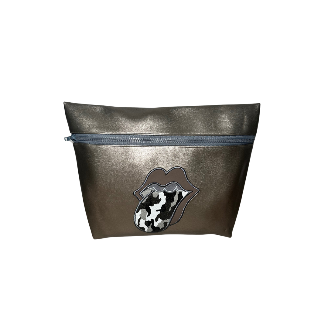 100% Handmade multipurpose bag in durable materials vinyl, leather, and recycled nylon. Features a large zipper pocket and a colorful embroidered design on the front.