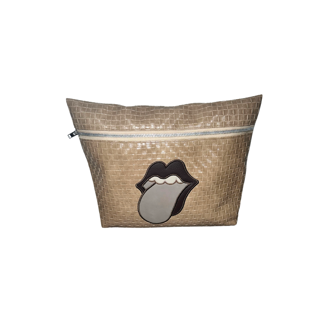 100% Handmade multipurpose bag in durable materials vinyl, leather, and recycled nylon. Features a large zipper pocket and a colorful embroidered design on the front.