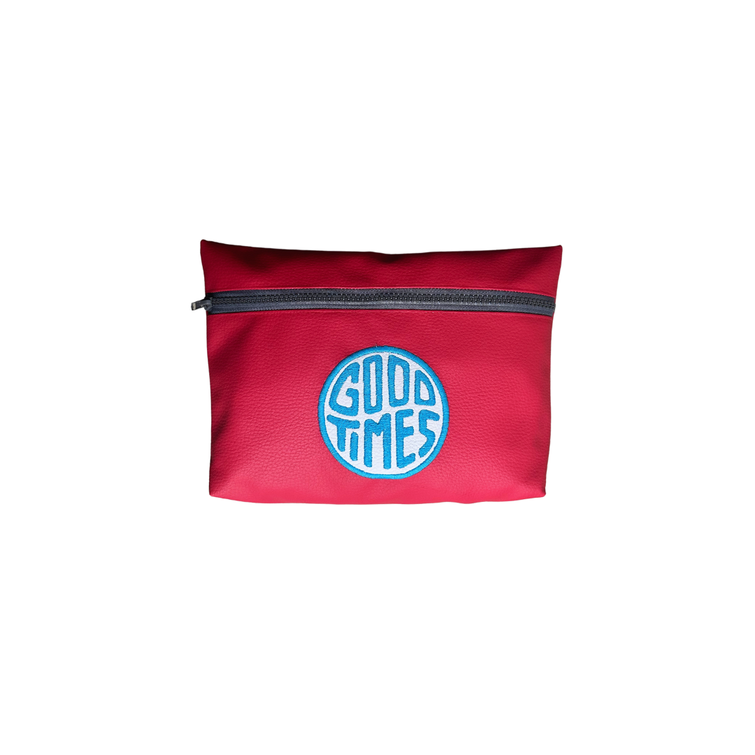 100% Handmade multipurpose bag in durable materials vinyl, leather, and recycled nylon. Features a large zipper pocket and a colorful embroidered design on the front.