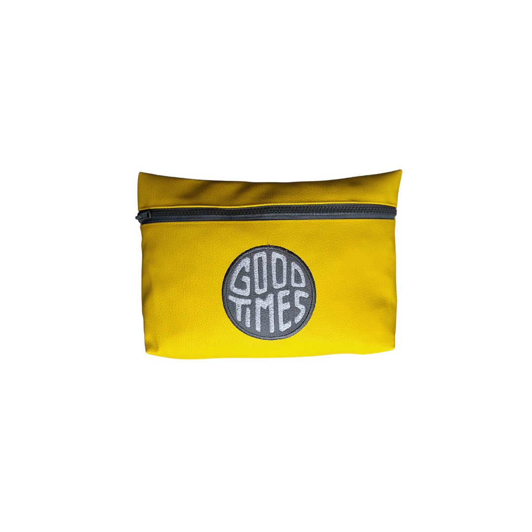 100% Handmade multipurpose bag in durable materials vinyl, leather, and recycled nylon. Features a large zipper pocket and a colorful embroidered design on the front.
