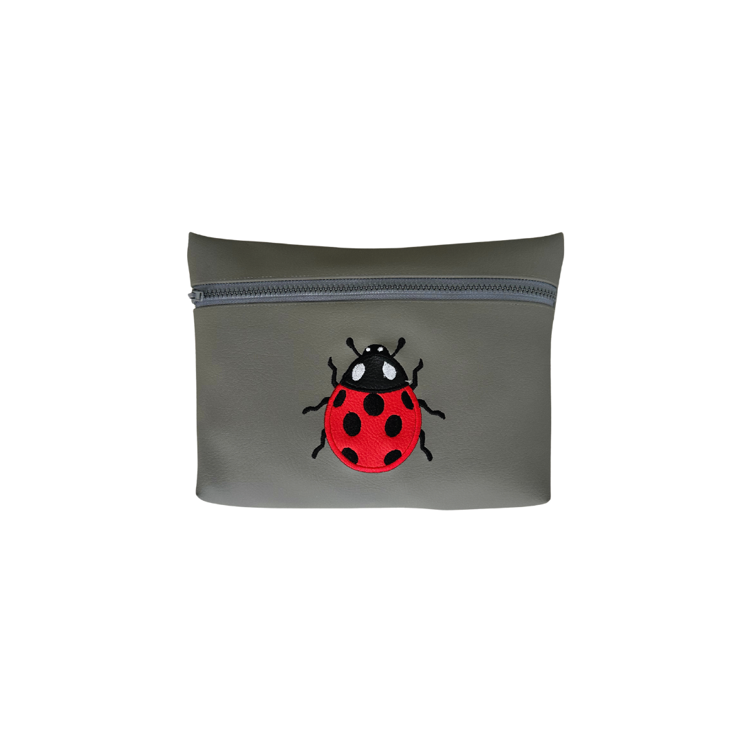 100% Handmade multipurpose bag in durable materials vinyl, leather, and recycled nylon. Features a large zipper pocket and a colorful embroidered design on the front.