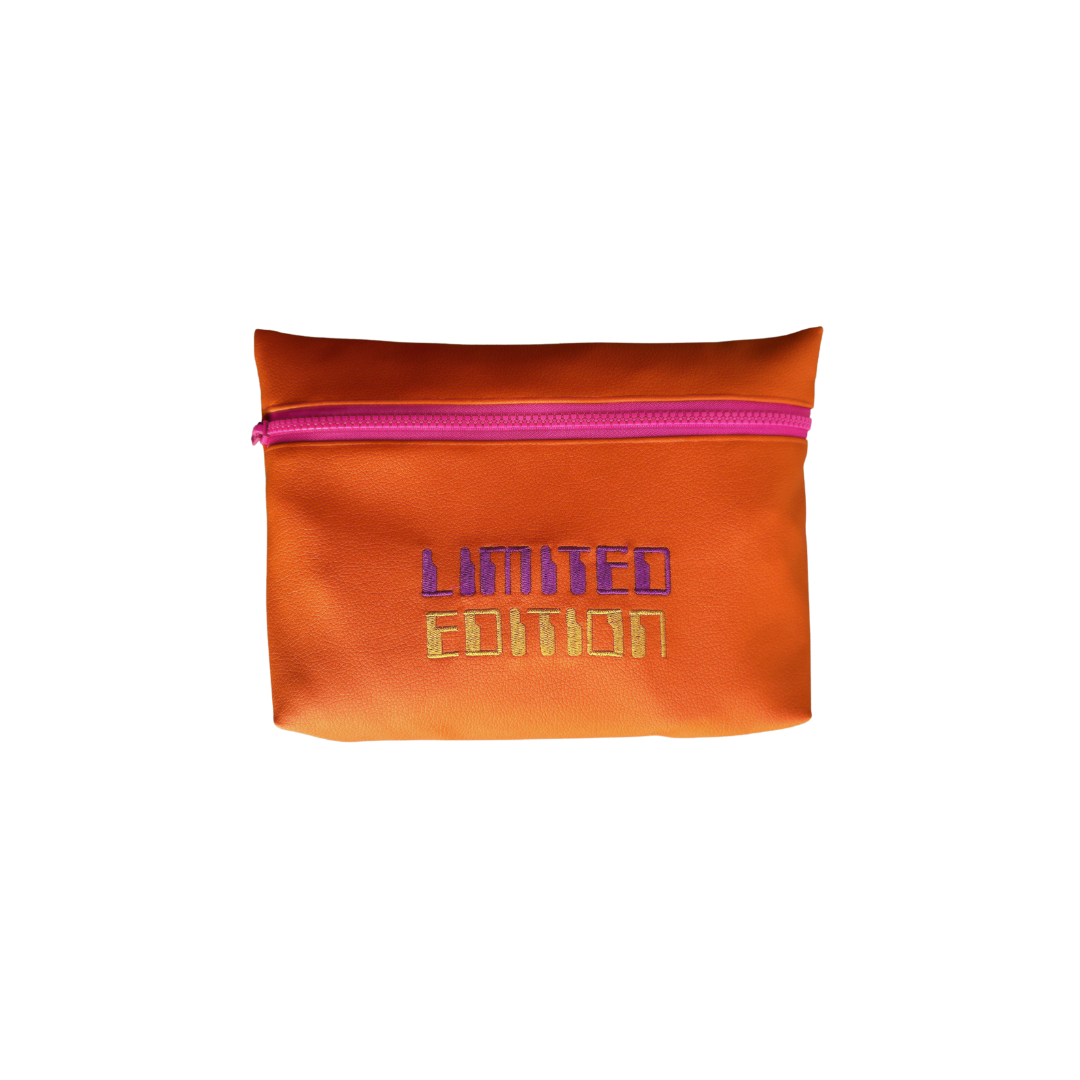 100% Handmade multipurpose bag in durable materials vinyl, leather, and recycled nylon. Features a large zipper pocket and a colorful embroidered design on the front.