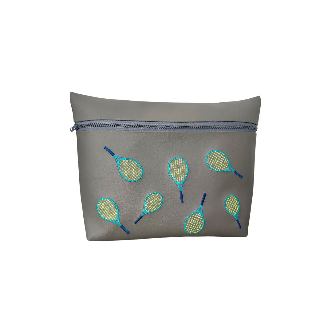 100% Handmade multipurpose bag in durable materials vinyl, leather, and recycled nylon. Features a large zipper pocket and a colorful embroidered design on the front.