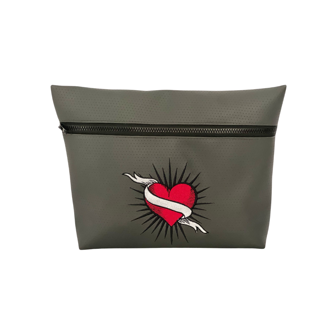 100% Handmade multipurpose bag in durable materials vinyl, leather, and recycled nylon. Features a large zipper pocket and a colorful embroidered design on the front.