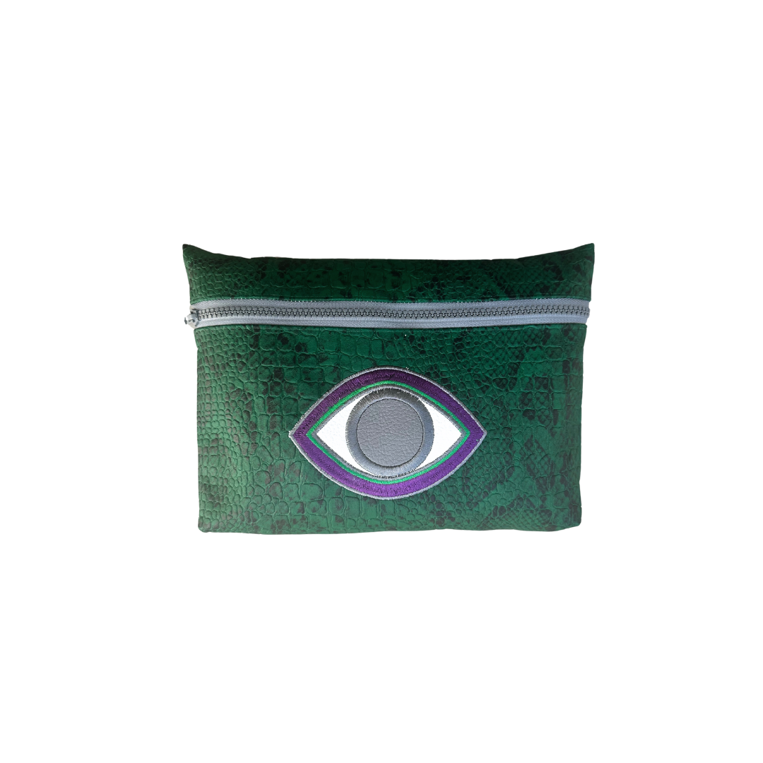 100% Handmade multipurpose bag in durable materials vinyl, leather, and recycled nylon. Features a large zipper pocket and a colorful embroidered design on the front.