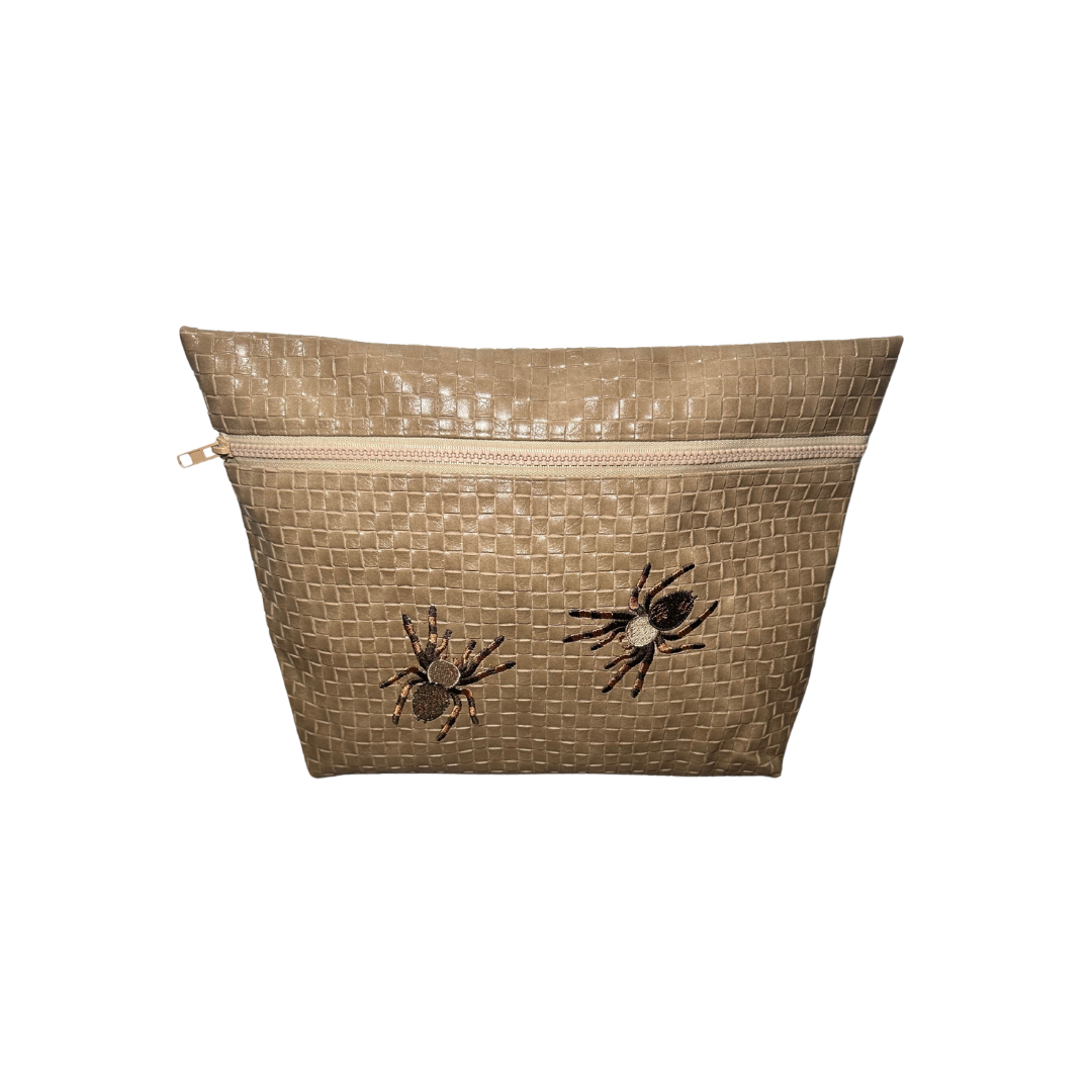 100% Handmade multipurpose bag in durable materials vinyl, leather, and recycled nylon. Features a large zipper pocket and a colorful embroidered design on the front.