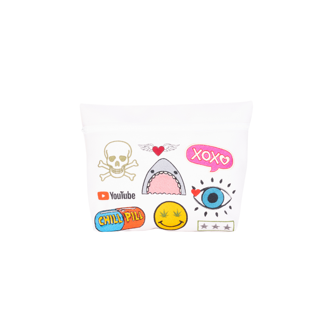 100% Handmade multipurpose bag in durable materials vinyl, leather, and recycled nylon. Features a large zipper pocket and colorful embroidered designs on the front.