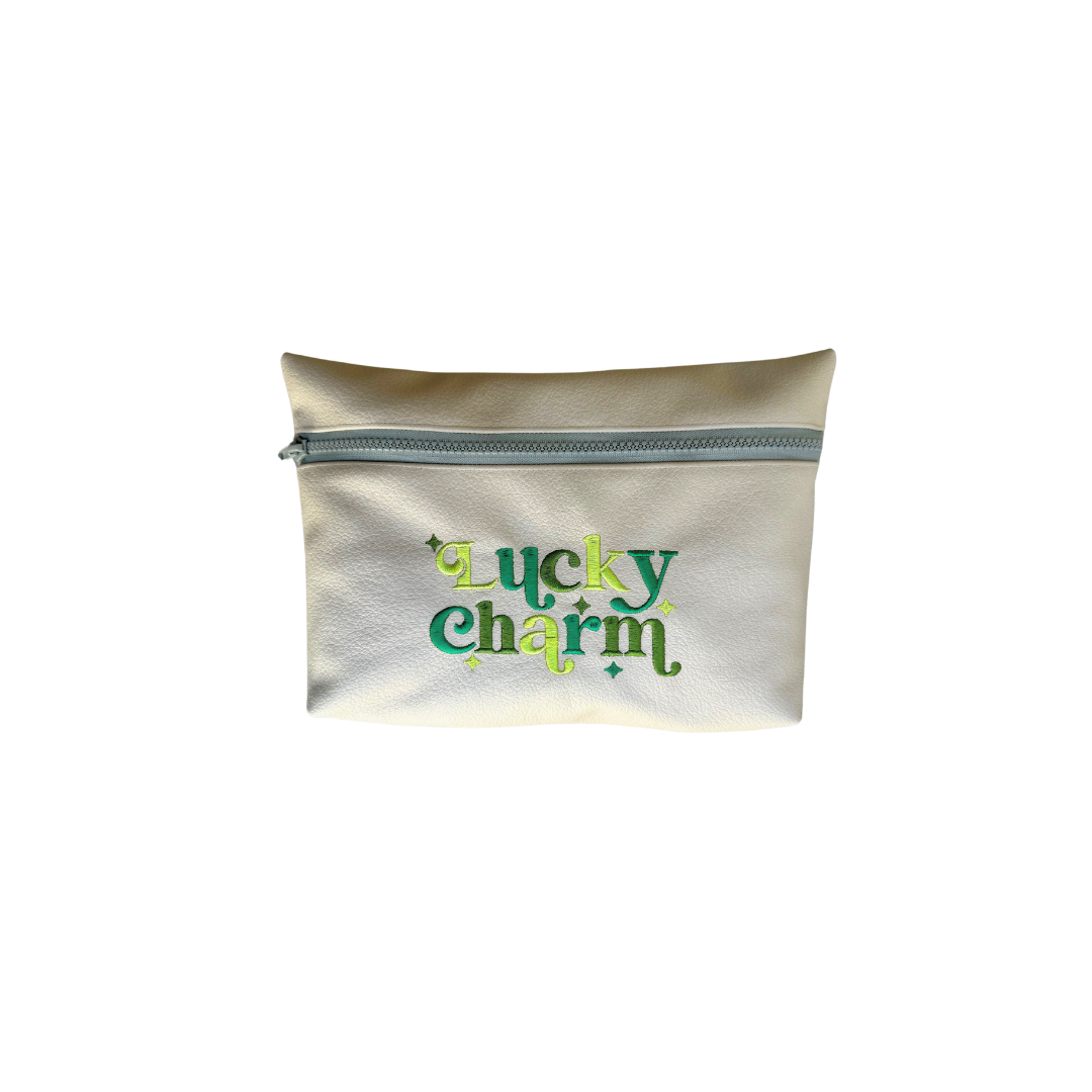 100% Handmade multipurpose bag in durable materials vinyl, leather, and recycled nylon. Features a large zipper pocket and a colorful embroidered design on the front.