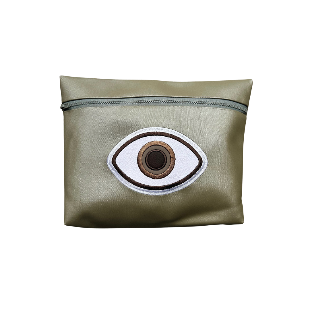 100% Handmade multipurpose bag in durable materials vinyl, leather, and recycled nylon. Features a large zipper pocket and a colorful embroidered design on the front.