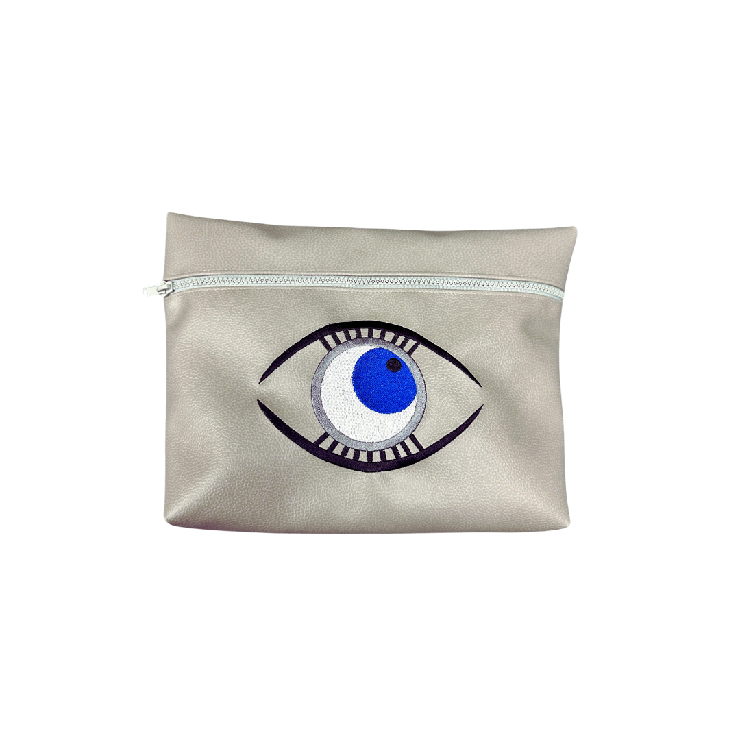 100% Handmade multipurpose bag in durable materials vinyl, leather, and recycled nylon. Features a large zipper pocket and a colorful embroidered design on the front.
