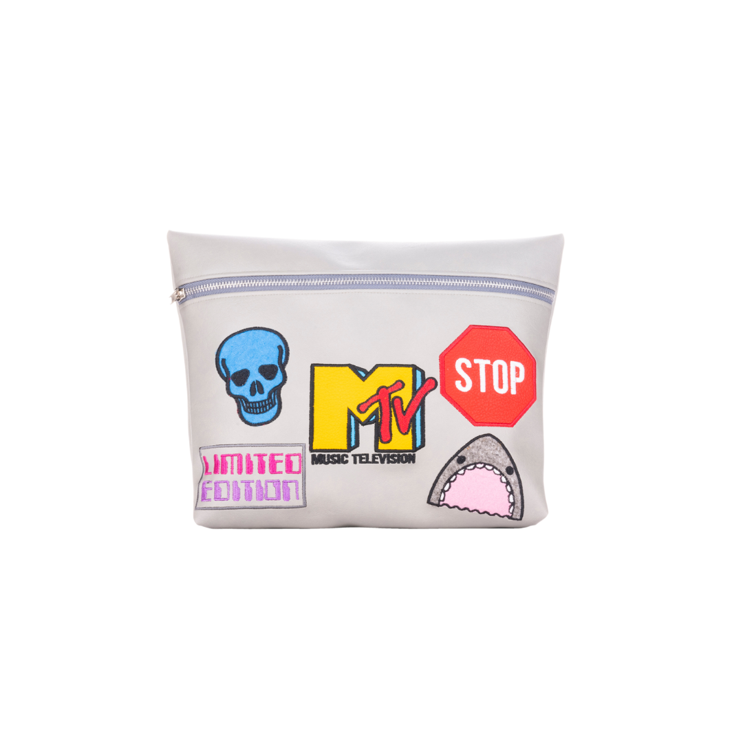 100% Handmade multipurpose bag in durable materials vinyl, leather, and recycled nylon. Features a large zipper pocket and a colorful embroidered design on the front.