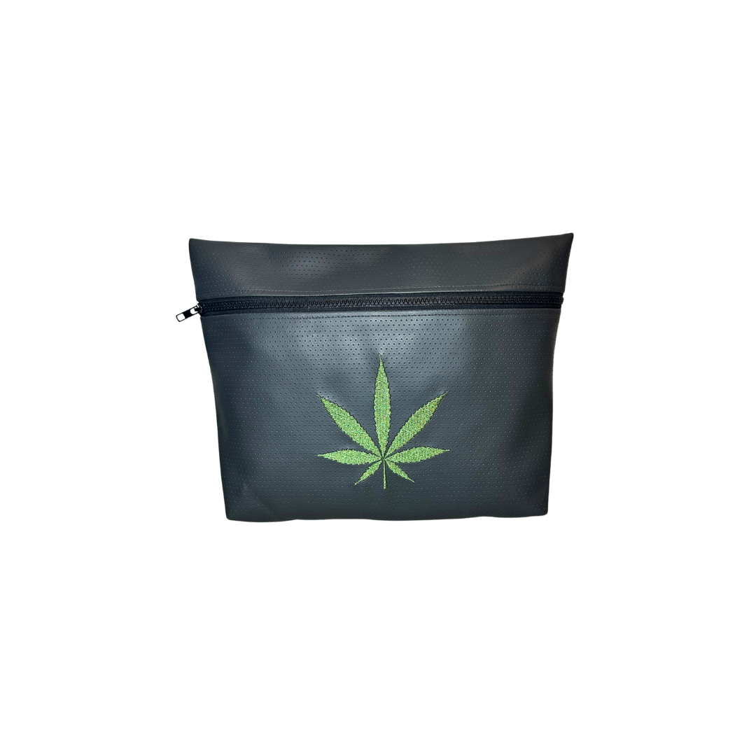 100% Handmade multipurpose bag in durable materials vinyl, leather, and recycled nylon. Features a large zipper pocket and a colorful embroidered design on the front.