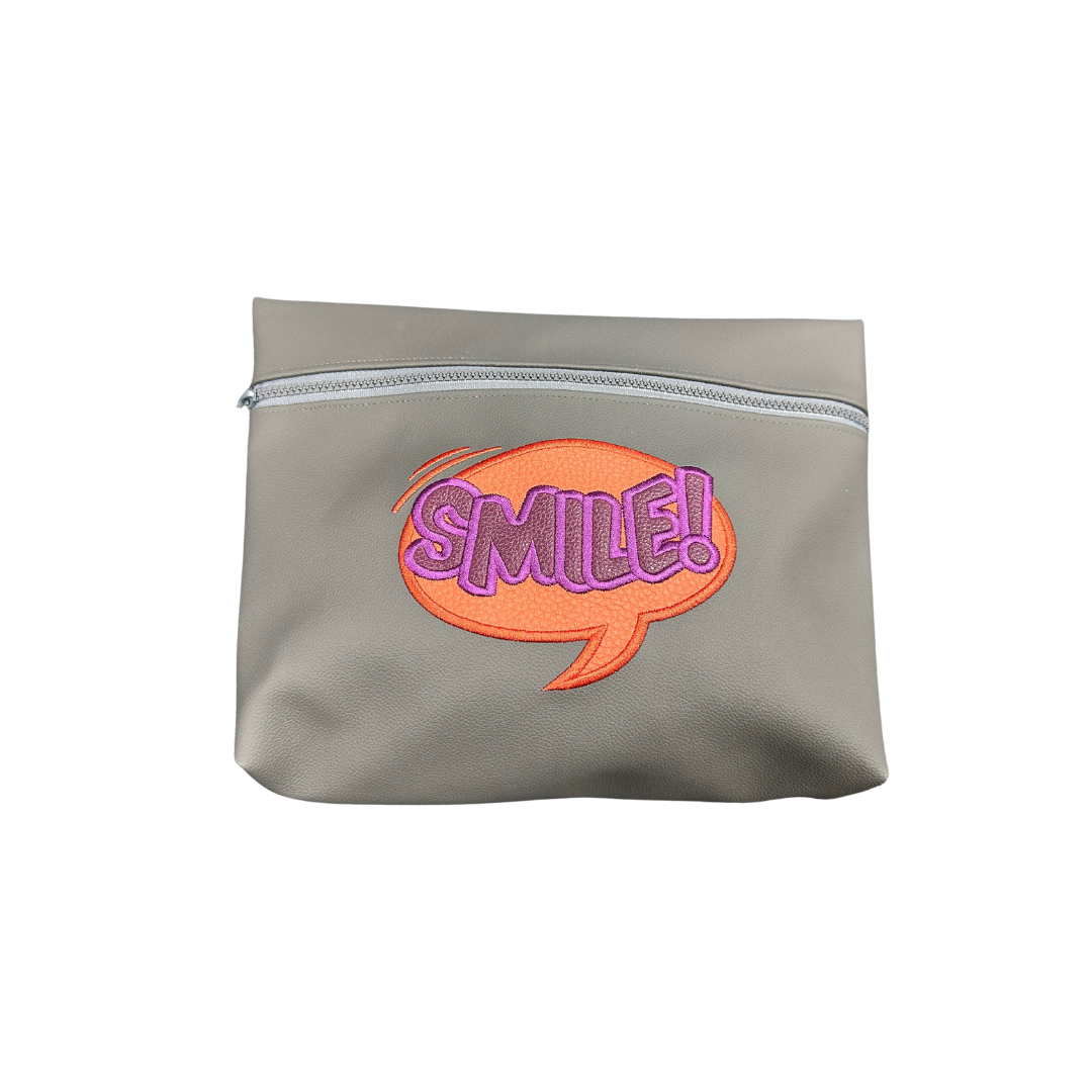 100% Handmade multipurpose bag in durable materials vinyl, leather, and recycled nylon. Features a large zipper pocket and a colorful embroidered design on the front.