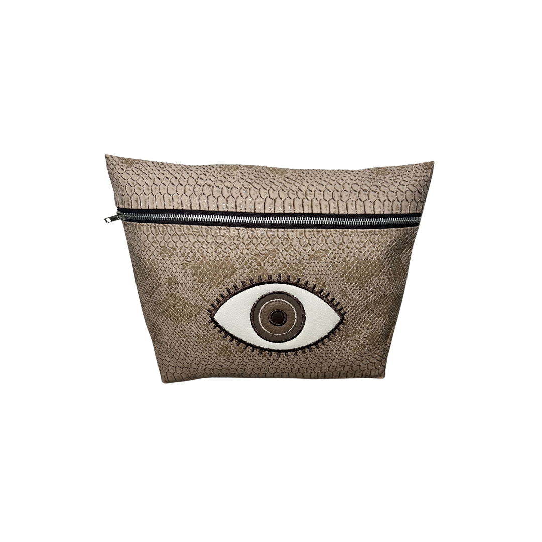 100% Handmade multipurpose bag in durable materials vinyl, leather, and recycled nylon. Features a large zipper pocket and a colorful embroidered design on the front.