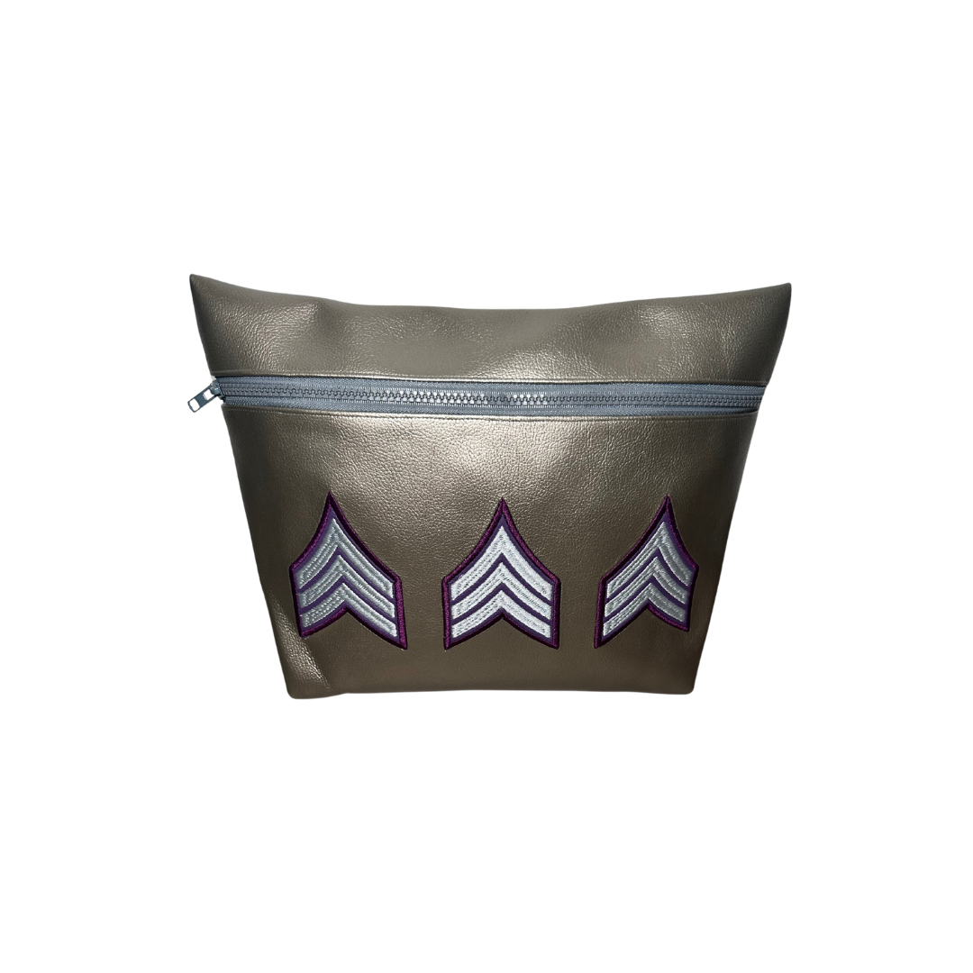 100% Handmade multipurpose bag in durable materials vinyl, leather, and recycled nylon. Features a large zipper pocket and a colorful embroidered design on the front.