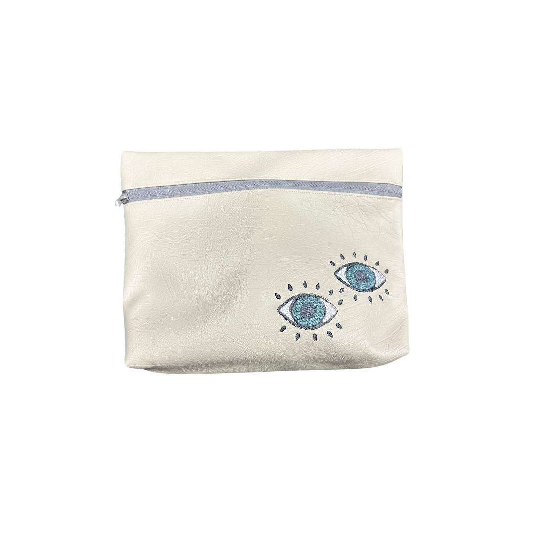 100% Handmade multipurpose bag in durable materials vinyl, leather, and recycled nylon. Features a large zipper pocket and a colorful embroidered design on the front.